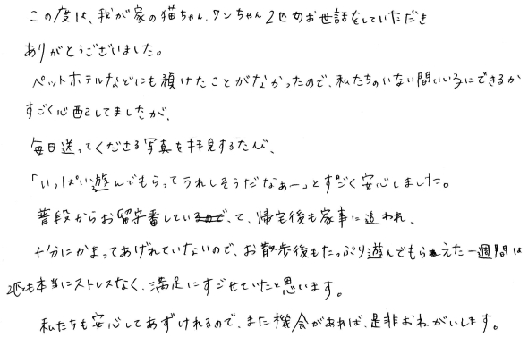 この度は、我が家の猫ちゃん、ワンちゃん2匹のお世話をいただき、ありがとうございました。
