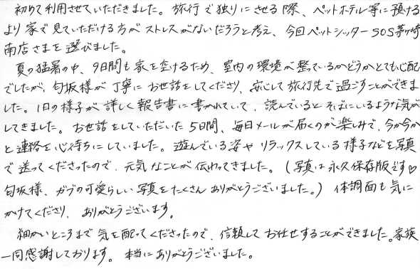 夏の猛暑の中、9日間も家を空けるため、室内の環境が整っているかどうかとても心配でしたが、匂坂様(シッター)が丁寧にお世話をしてくださり、安心して旅行先で過ごすことができました。