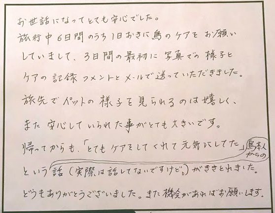 旅行中6日間のうち1日おきに鳥のケアをお願いしていまして、3日間の最初に写真での様子とケアの記録コメントをメールで送っていただきました。