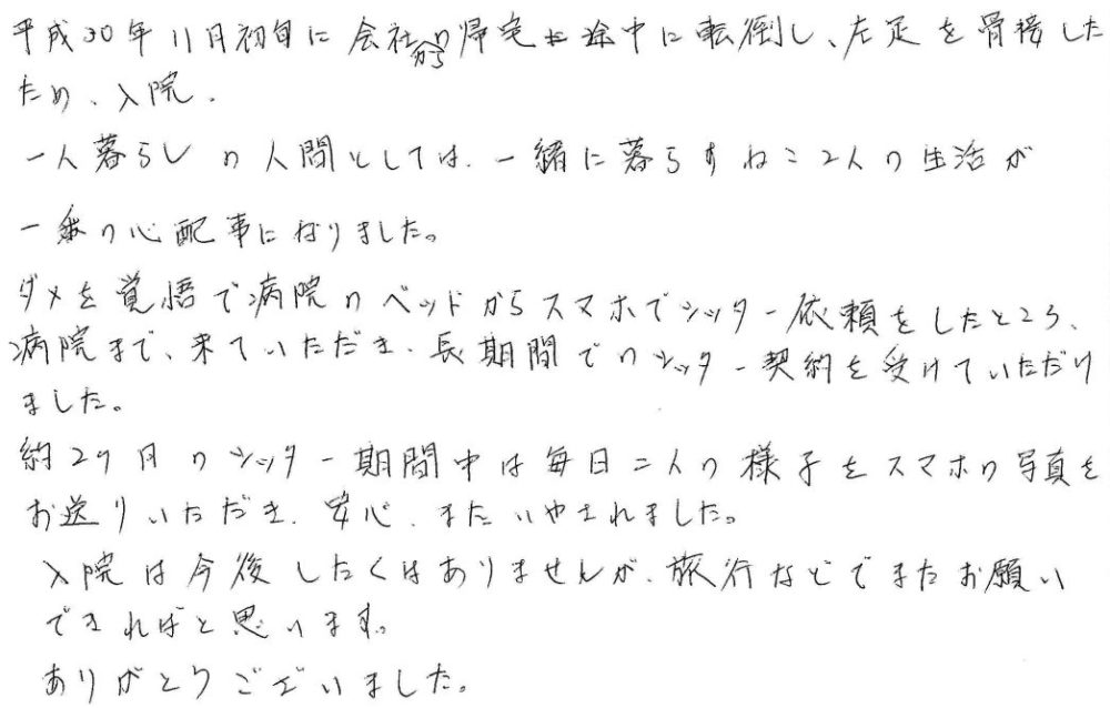 ダメを覚悟で病院のベッドからスマホでシッター依頼をしたところ、病院まで来ていただき、長期間でのシッター契約を受けていただけました。