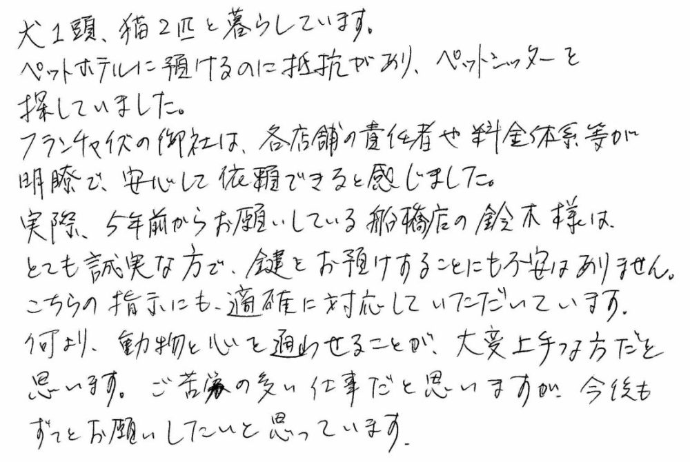ペットホテルに預けるのに抵抗があり、ペットシッターを探していました。