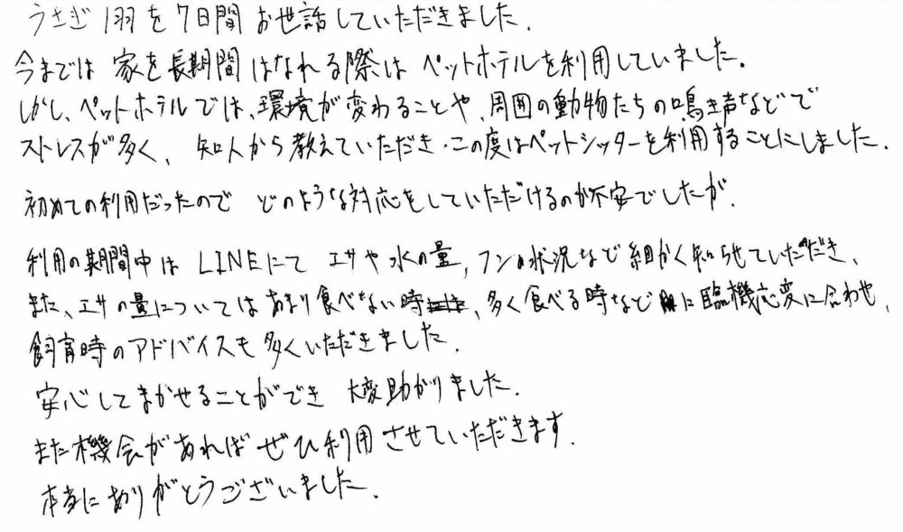 初めての利用だったので、どのような対応をしていただけるのか不安でしたが、利用の期間中はLINEにてエサや水の量、フンの状況など細かく知らせていただき、また、エサの量についてはあまり食べない時、多く食べる時などに臨機応変に合わせ、飼育時のアドバイスも多くいただきました。