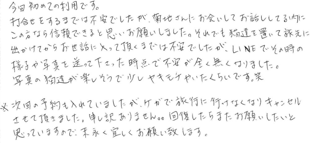 それでも猫達を置いて旅先に出かけてからお世話に入って頂くまでは不安でしたが、LINEでその時の様子や写真を送って下さった時点で不安が全く無くなりました。