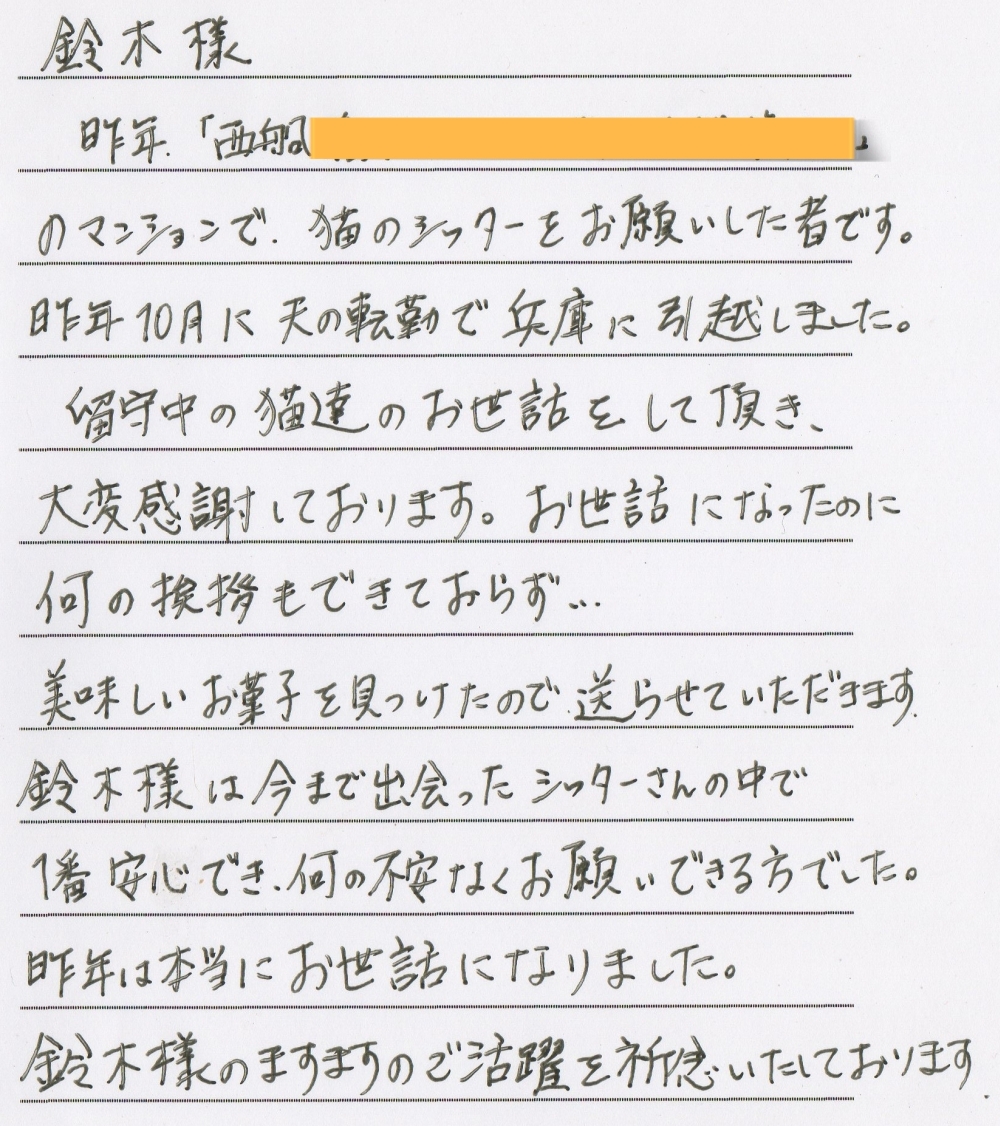 留守中の猫達のお世話をして頂き、大変感謝しております。