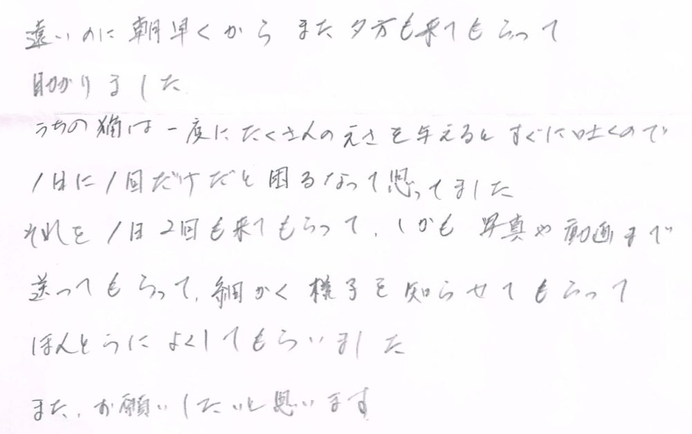 それを1日2回も来てもらって、しかも写真や動画まで送ってもらって、細かく様子を知らせてもらって、ほんとうによくしてもらいました。