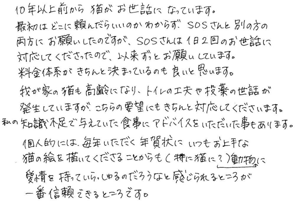 最初はどこに頼んだらいいのかわからず、SOSさんと別の方の両方にお願いしたのですが、SOSさんは1日2回のお世話に対応してくださったので、以来ずっとお願いしています。料金体系がきちんと決まっているのも良いと思います。