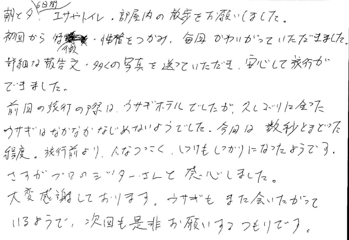 朝と夕(6日間)エサやトイレ、部屋内の散歩をお願いしました。