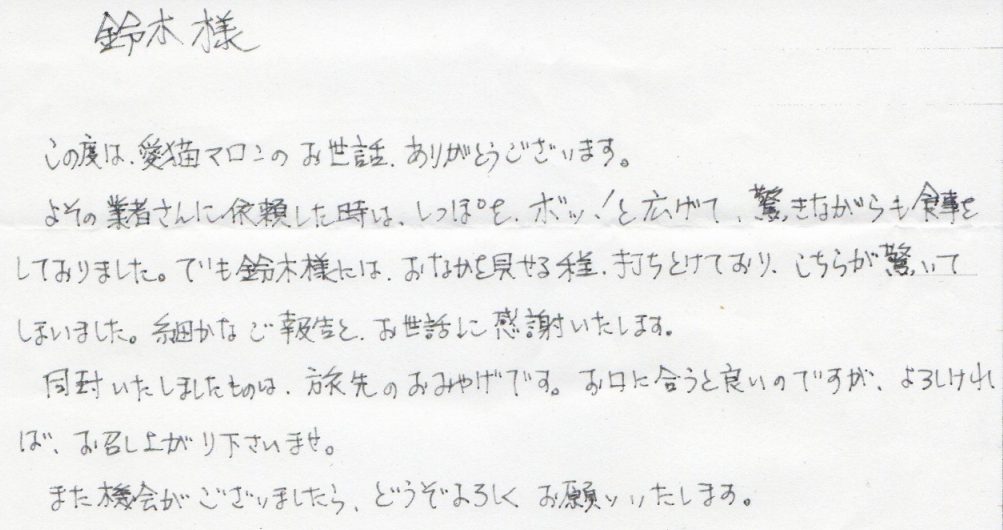 この度は、愛猫マロンのお世話、ありがとうございます。