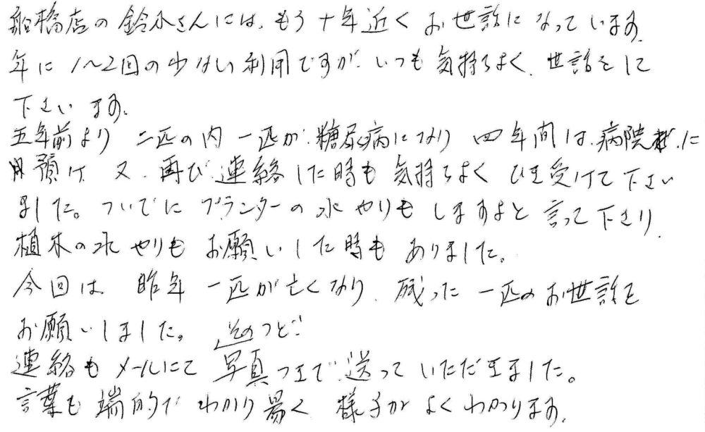 五年前より二匹の内一匹が糖尿病になり、四年間は病院に預け、又再び連絡した時も気持ちよくひき受けて下さいました。