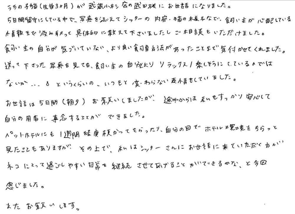 お世話は5日間(朝夕)お願いしましたが、途中からは私もすっかり安心して自分の用事に専念することができました。