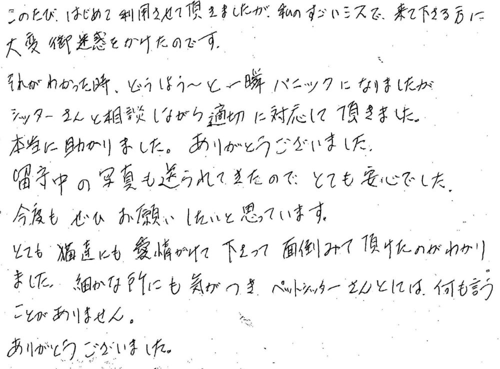 細かな所にも気がつき、ペットシッターさんとしては何も言うことがありません。