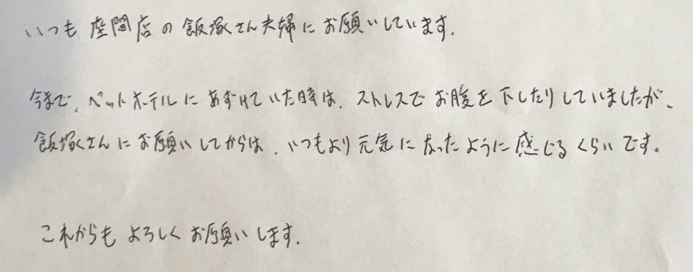 今までペットホテルにあずけていた時は、ストレスでお腹を下したりしていましたが、飯塚さんにお願いしてからは、いつもより元気になったように感じるくらいです。