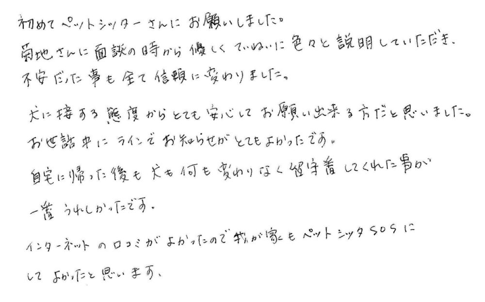 インターネットの口コミがよかったので我が家もペットシッターSOSにしてよかったと思います。