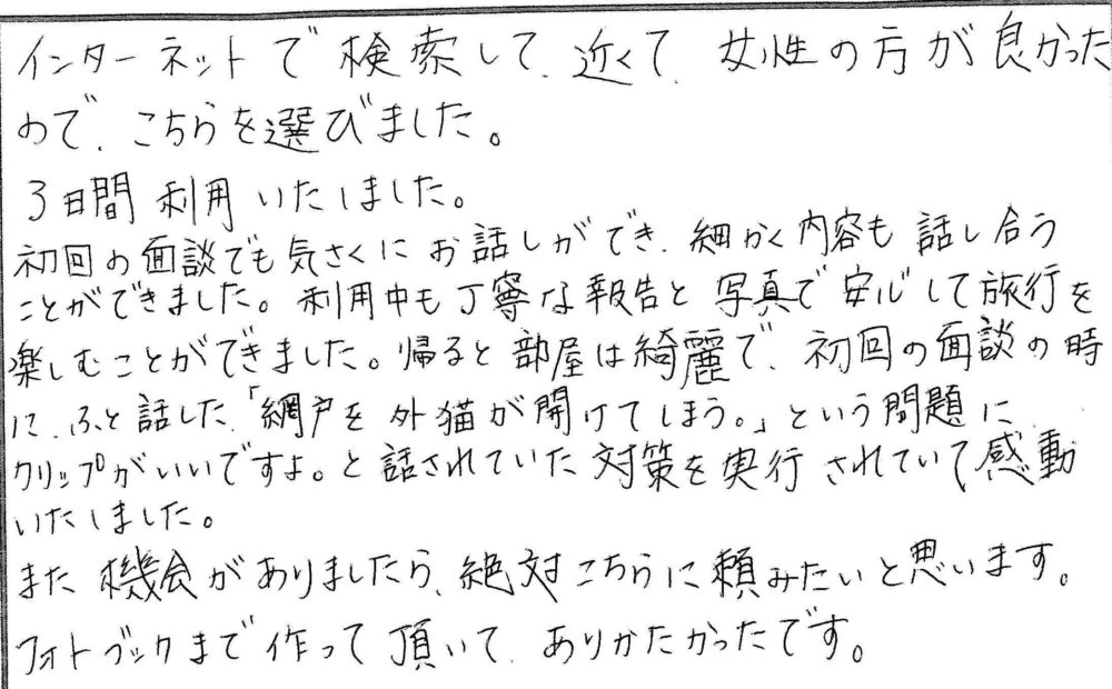 帰ると部屋は綺麗で、初回の面談の時に、ふと話した「網戸を外猫が開けてしまう。」という問題にクリップがいいですよ。と話されていた対策を実行されていて感動いたしました。