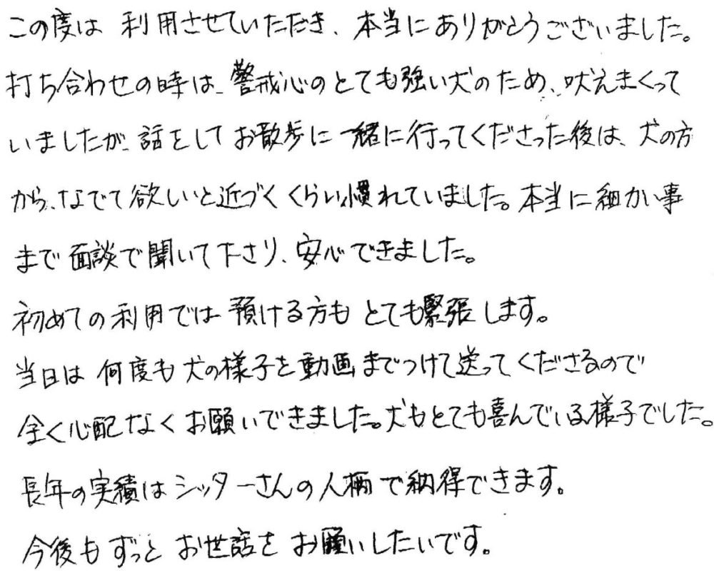 当日は何度も犬の様子を動画までつけて送ってくださるので、全く心配なくお願いできました。