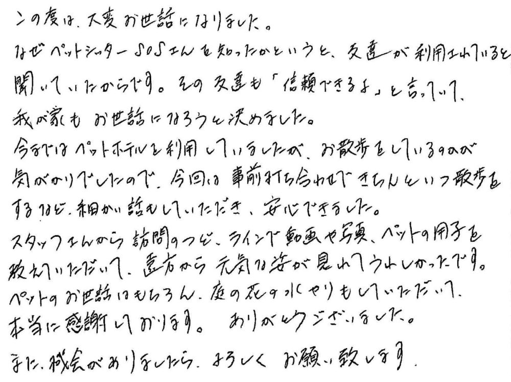 今まではペットホテルを利用していましたが、お散歩をしているのかが気がかりでしたので、今回は事前打ち合わせできちんといつ散歩をするなど、細かい話もしていただき、安心できました。