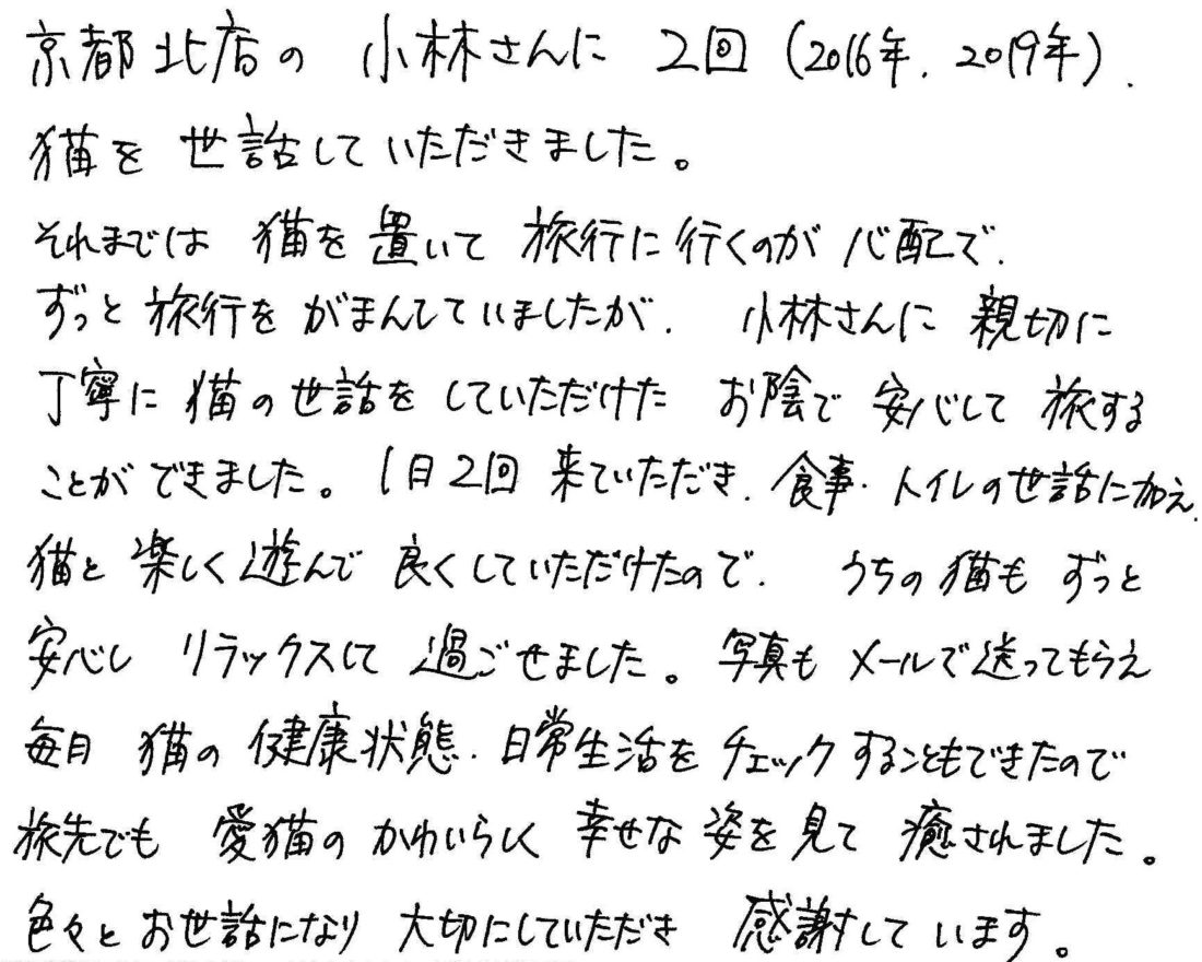 それまでは猫を置いて旅行に行くのが心配で、ずっと旅行をがまんしていましたが、小林さんに親切に丁寧に猫の世話をしていただけたお陰で、安心して旅することができました。