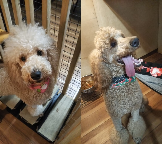 うちでは大型犬(スタンダードプードル)を2頭、おさんぽしていただきました。
