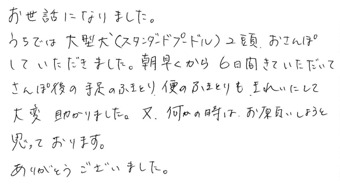 朝早くから6日間きていただいて、さんぽ後の手足のふきとり、便のふきとりも、きれいにして大変助かりました。