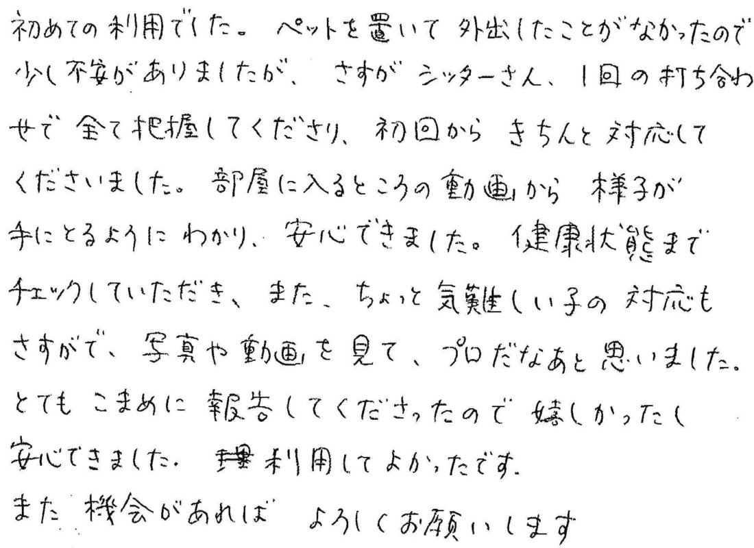 ペットを置いて外出したことがなかったので少し不安がありましたが、さすがシッターさん、1回の打ち合わせで全て把握してくださり、初回からきちんと対応してくださいました。