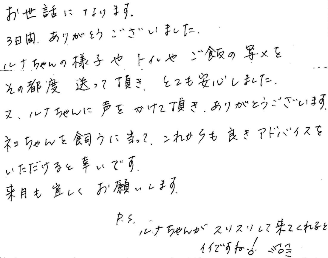 ルナちゃんの様子やトイレやご飯の写メをその都度送って頂き、とても安心しました。