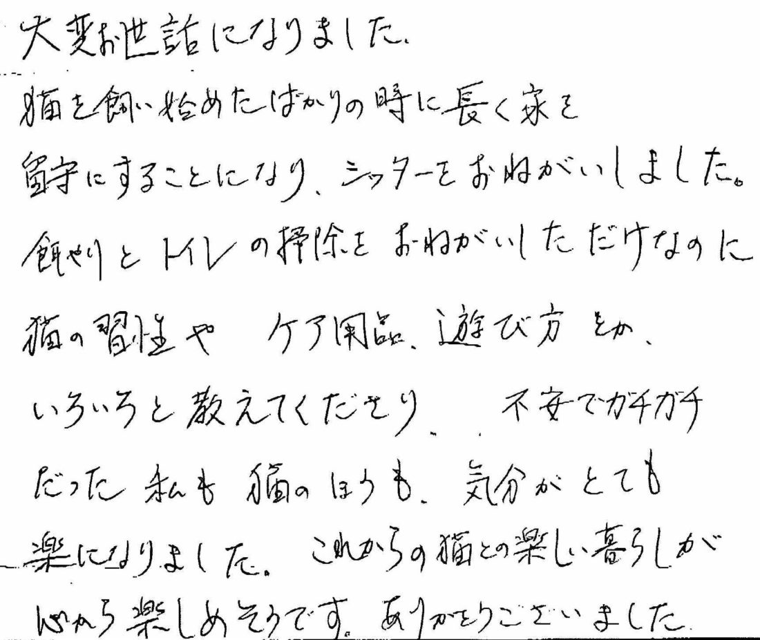 餌やりとトイレの掃除をおねがいしただけなのに、猫の習性やケア用品、遊び方とかいろいろ教えてくださり、不安でガチガチだった私も猫のほうも、気分がとても楽になりました。