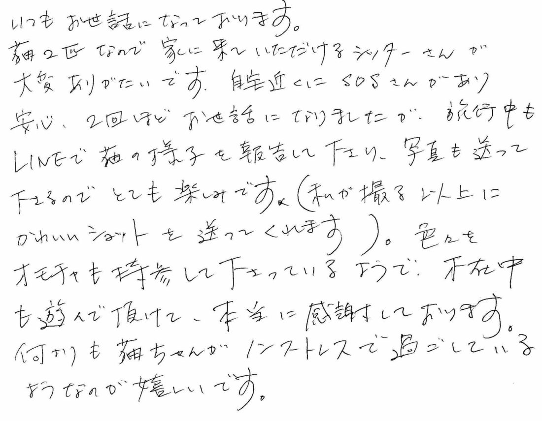 自宅近くにSOSさんがあり安心、2回ほどお世話になりましたが、旅行中もLINEで猫の様子を報告して下さり、写真も送って下さるのでとても楽しみです(私が撮る以上にかわいいショットを送ってくれます)。