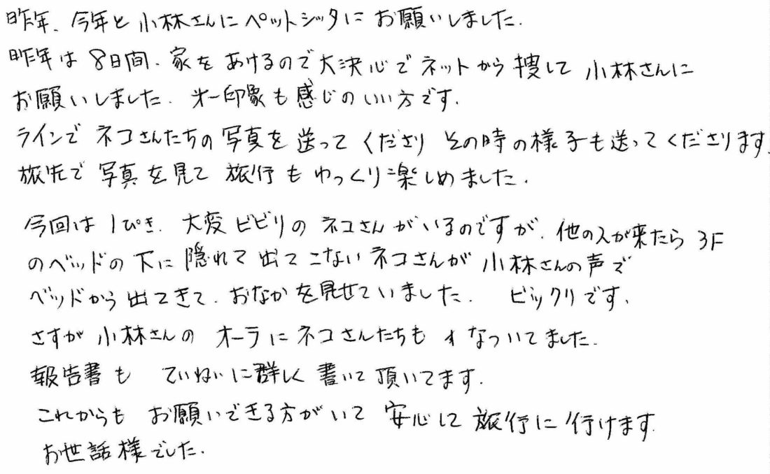 昨年、今年と小林さんにペットシッターをお願いしました。