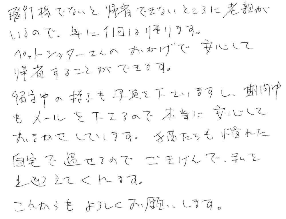 ペットシッターさんのおかげで安心して帰省することができます。
