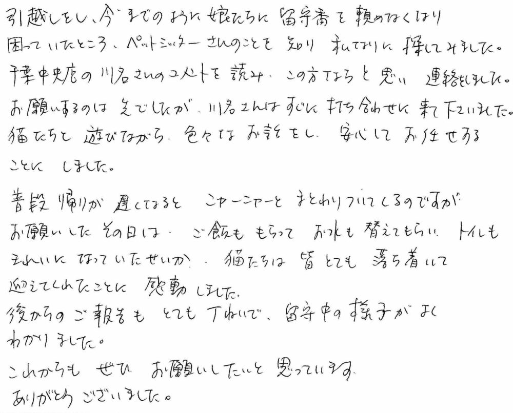 普段帰りが遅くなると、ニャーニャーとまとわりついてくるのですが、お願いしたその日は、ご飯ももらってお水も替えてもらい、トイレもきれいになっていたせいか、猫たちは皆とても落ち着いて迎えてくれたことに感動しました。