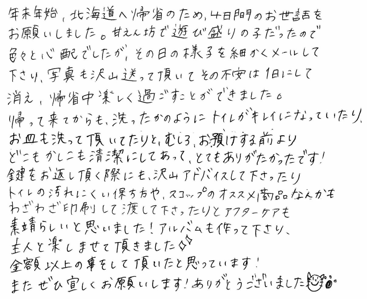 年末年始、北海道へ帰省のため、4日間のお世話をお願いしました。