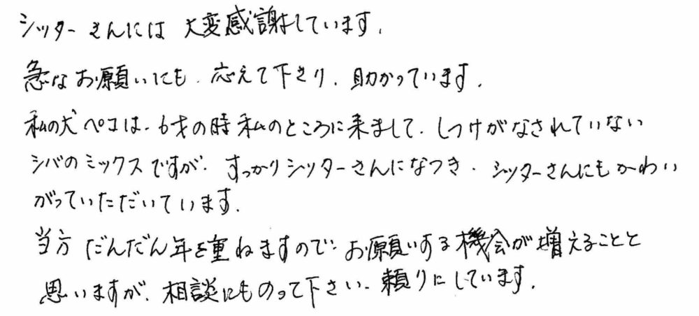 私の犬ペコは、6才の時私のところに来まして、しつけがなされていないシバのミックスですが、すっかりシッターさんになつき、シッターさんにもかわいがっていただいています。