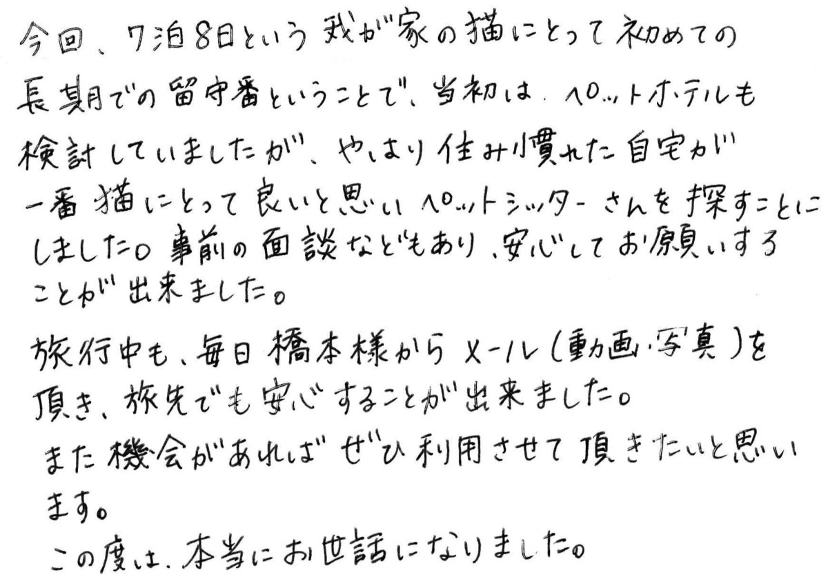 旅行中も、毎日橋本様からメール(動画・写真)を頂き、旅先でも安心することが出来ました。