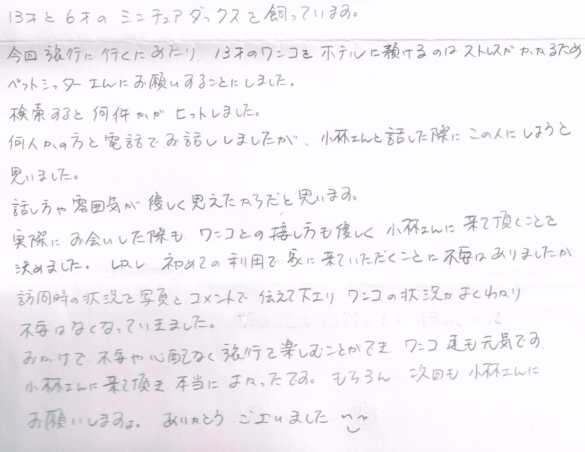 実際にお会いした際も、ワンコとの接し方も優しく、小林さんに来て頂くことを決めました。