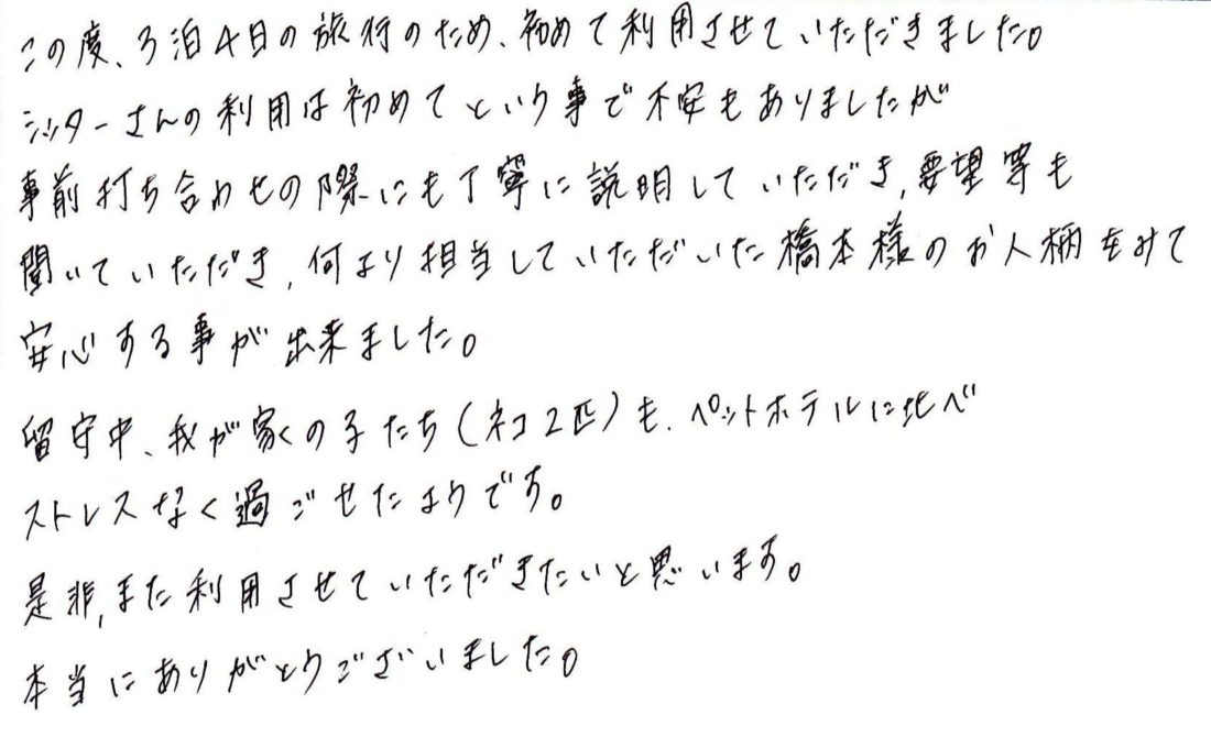 留守中、我が家の子たち(ネコ2匹)も、ペットホテルに比べ