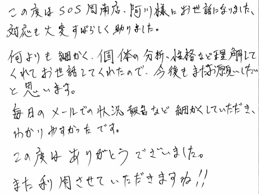 何よりも細かく、個体の分析、性格など理解してくれてお世話してくれたので、今後もまたお願いしたいと思います。