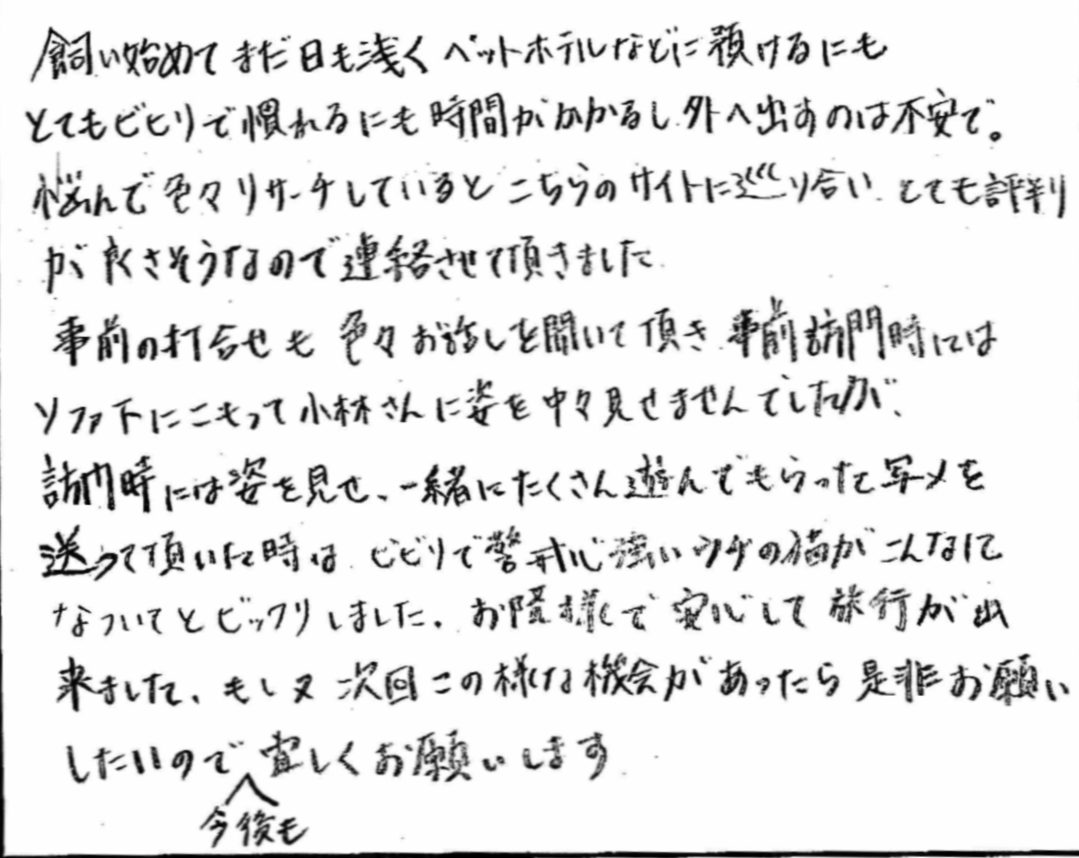 事前の打合せも色々お話しを聞いて頂き、事前訪問時にはソファ下にこもって小林さんに姿を中々見せませんでしたが、訪問時には姿を見せ、一緒にたくさん遊んでもらった写メを送って頂いた時は、ビビリで警戒心強いウチの猫がこんなになついてとビックリしました。