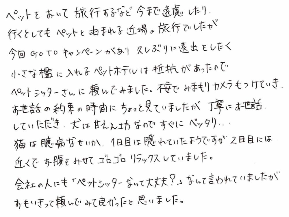 ペットをおいて旅行するなど今まで遠慮したり、行くとしてもペットと泊まれる近場の旅行でしたが、今回Gotoキャンペーンがあり久しぶりに遠出をしたく、小さな檻に入れるペットホテルは抵抗があったので、ペットシッターさんに頼んでみました。
