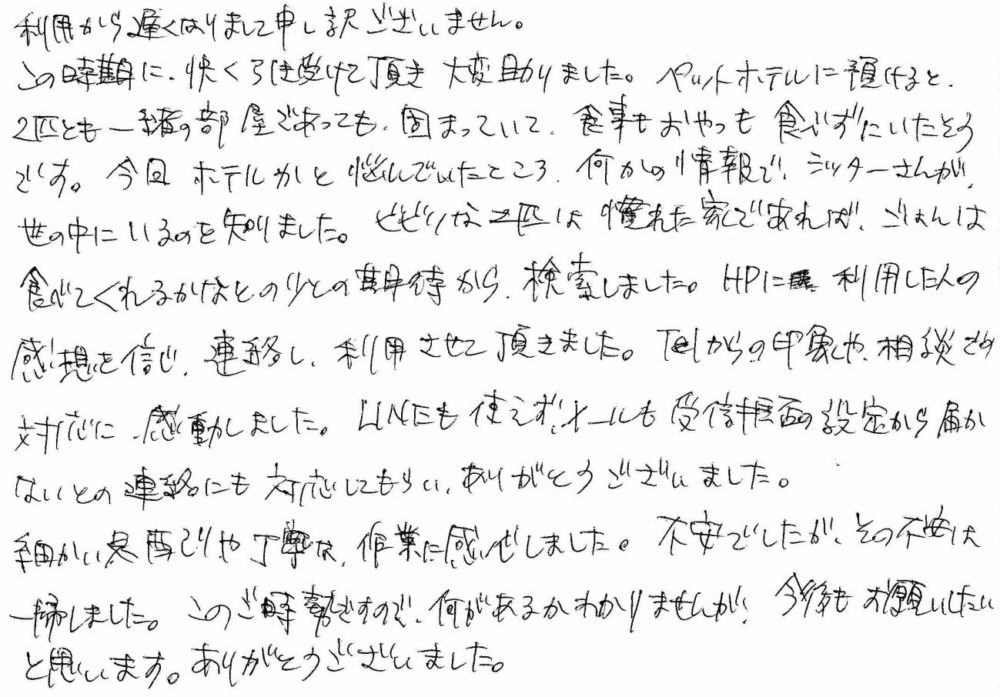 ペットホテルに預けると、2匹とも一緒の部屋であっても固まっていて、食事もおやつも食べずにいたそうです。