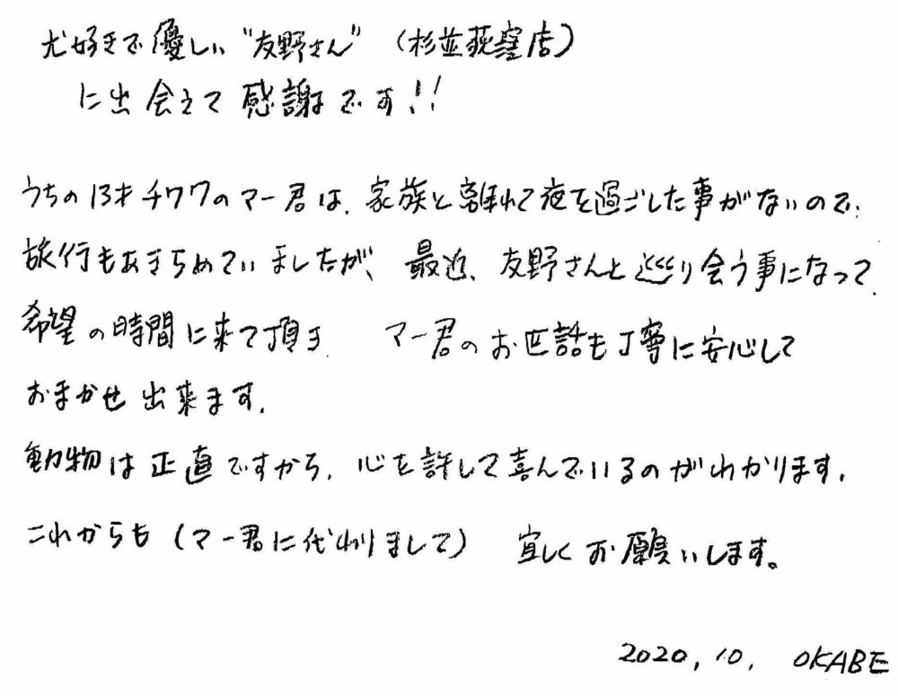 うちの13才のチワワのマー君は、家族と離れて夜を過ごした事がないので、旅行もあきらめていましたが、最近友野さんと巡り合う事になって、希望の時間に来て頂き、マー君のお世話も丁寧に安心しておまかせ出来ます。