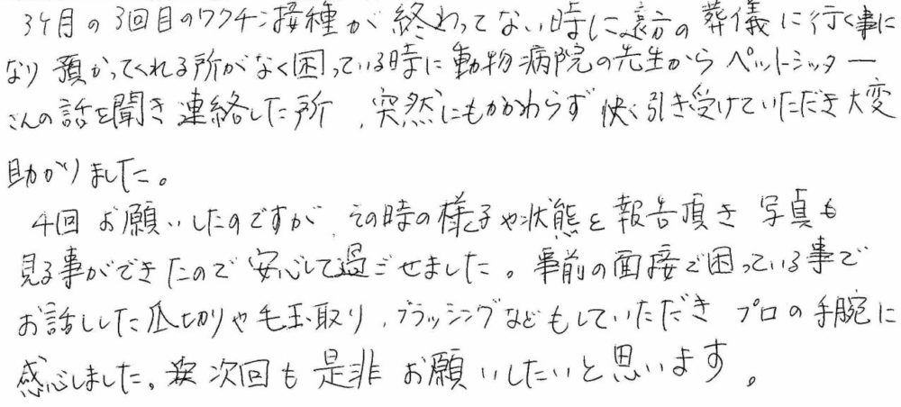 3ヶ月の3回目のワクチン接種が終わってない時に遠方の葬儀に行く事になり、預ってくれる所がなく困っている時に動物病院の先生からペットシッターさんの話を聞き連絡した所、突然にもかかわらず快く引き受けていただき大変助かりました。