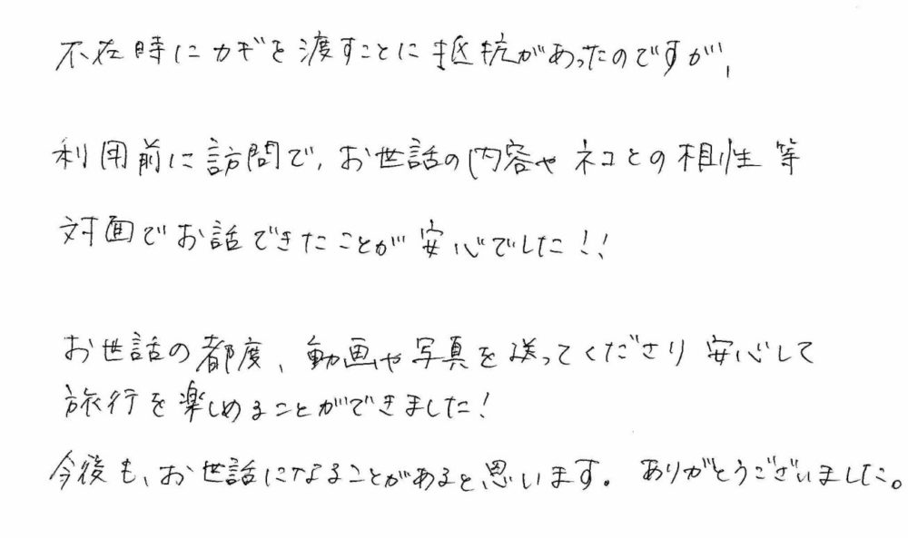 不在時にカギを渡すことに抵抗があったのですが、利用前に訪問で、お世話の内容やネコとの相性等対面でお話しできたことが安心でした!!