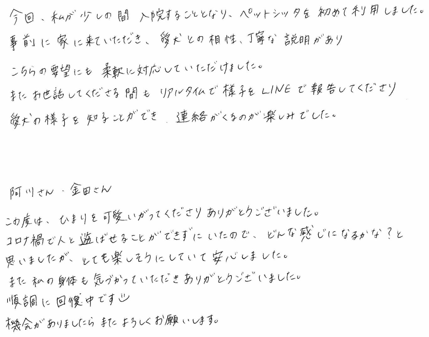 今回、私が少しの間入院することとなり、ペットシッターを初めて利用しました。