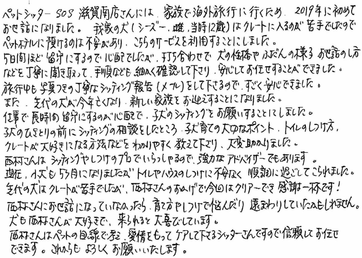ペットシッターSOS滋賀南店さんには、家族で海外旅行に行くため、2019年に初めてお世話になりました。