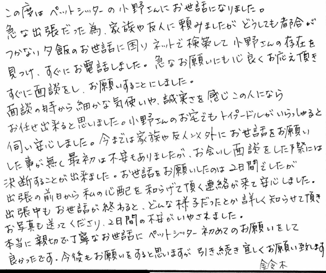 出張中もお世話が終わると、どんな様子だったとか詳しく知らせて頂きお写真も送ってくださり、2日間の不安がいやされました。