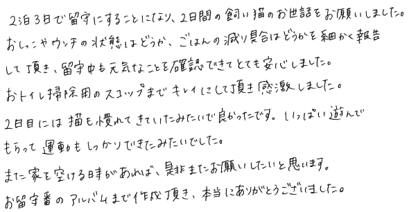 おしっこやウンチの状態はどうか、ごはんの減り具合はどうかを細かく報告して頂き、留守中も元気なことを確認できてとても安心しました。
