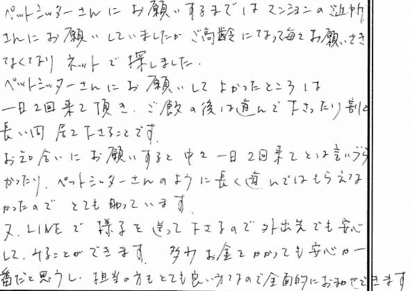 ペットシッターさんにお願いするまでは、マンションのご近所さんにお願いしていましたが、ご高齢になって毎々お願いできなくなりネットで探しました。