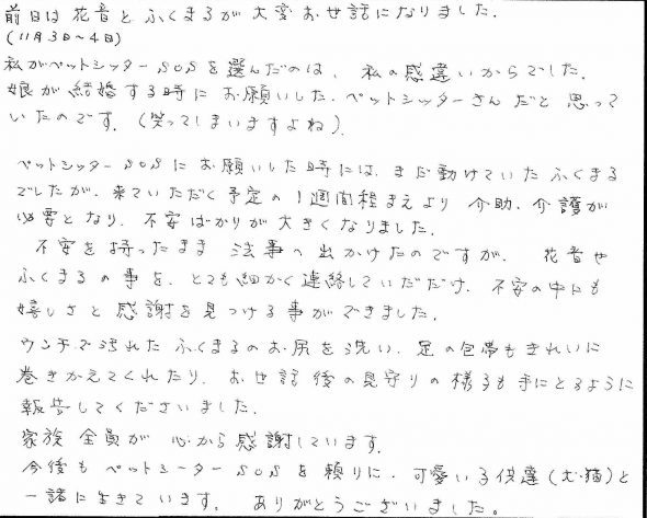 ペットシッターSOSにお願いした時には、まだ動けていたふくまるでしたが、来ていただく予定の1週間程まえより介助、介護が必要となり、不安ばかりが大きくなりました。
