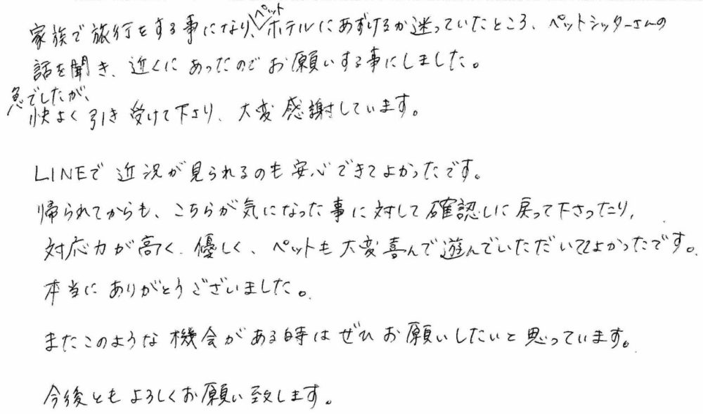 家族で旅行をする事になり、ペットホテルにあずけるか迷っていたところ、ペットシッターさんの話を聞き、近くにあったのでお願いする事にしました。