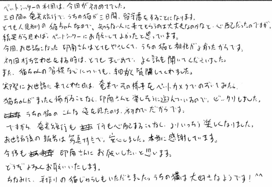 とても人見知りの猫ちゃんなので、知らない人に来てもらうのは大丈夫なのかなと心配だったのですが、結果から見れば、ペットシッターにお願いしてよかったと思っています。